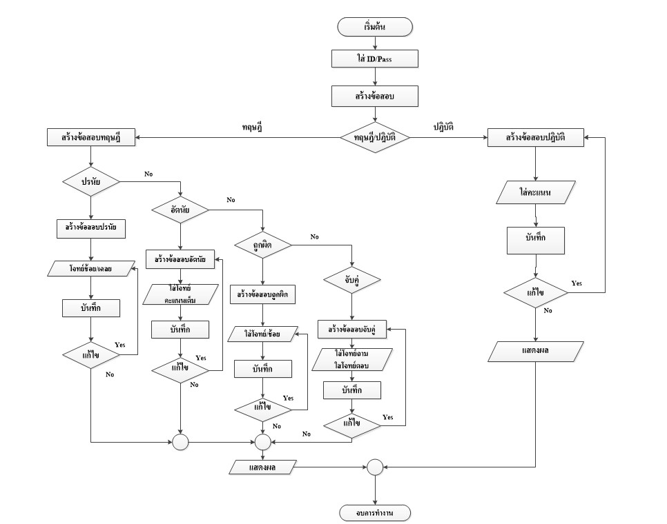 1. วิเคราะห์สภาพปัญหาหรือประเมินความต้องการของผู้ใช้โปรแกรม 2. ศึกษาทฤษฎีและหลักการที่เกี่ยวข้อง 3. กำหนดขอบเขตของโปรแกรม ทรัพยากร และฐานข้อมูลที่ใช้เขียนโปรแกรม 4. ออกแบบและสร้างโปรแกรมทำข้อสอบ ระบบออนไลน์ ![]() ภาพที่ 2 แผนผังการทำงานของโปรแกรม ![]() ภาพที่ 3 การทำงานของโปรแกรม 5 โปรแกรมโปรแกรมทำข้อสอบออนไลน์ 1) ภาพรวมของโปรแกรม ![]() ภาพที่ 4 หน้าการสร้างข้อสอบ ![]() ภาพที่ 5 หน้าโครงสร้างการทำข้อสอบอัตนัย ![]() ภาพที่ 6 หน้าโครงสร้างเพิ่มข้อสอบปฏิบัติ ![]() ภาพที่ 7 หน้าโครงสร้างเพิ่มคะแนนข้อสอบปฏิบัติ 6. ออกแบบเครื่องมือที่ใช้ประเมินประสิทธิภาพ แบบฟอร์มการตรวจสอบคุณภาพแบบสอบถาม ตารางที่ 1 แบบฟอร์มการตรวจสอบคุณภาพแบบสอบถามของผู้ทรงคุณวุฒิ ![]() การวิเคราะห์เลือกคำถามจากผู้ทรงคุณวุฒิ ตารางที่ 2 การวิเคราะห์เลือกคำถามจากผู้ทรงคุณวุฒิ ![]() แสดงการคิดคำนวณค่า IOC ข้อ 1 ผลรวมของคะแนนผู้เชี่ยวชาญ เท่ากับ 2 จำนวนผู้เชี่ยวชาญ 3 คน ค่า IOC เท่ากับ 2/3 = 0.667 มีค่ามากกว่า 0.5 ถือว่าคำถามข้อนี้ใช้ได้ ข้อ 2 ผลรวมของคะแนนผู้เชี่ยวชาญ เท่ากับ 3 จำนวนผู้เชี่ยวชาญ 3 คน ค่า IOC เท่ากับ 3/3 = 1 มีค่ามากกว่า 0.5 ถือว่าคำถามข้อนี้ใช้ได้ ข้อ 3 ผลรวมของคะแนนผู้เชี่ยวชาญ เท่ากับ 3 จำนวนผู้เชี่ยวชาญ 3 คน ค่า IOC เท่ากับ 3/3 = 1 มีค่ามากกว่า 0.5 ถือว่าคำถามข้อนี้ใช้ได้ ข้อ 4 ผลรวมของคะแนนผู้เชี่ยวชาญ เท่ากับ 3 จำนวนผู้เชี่ยวชาญ 3 คน ค่า IOC เท่ากับ 3/3 = 1 มีค่ามากกว่า 0.5 ถือว่าคำถามข้อนี้ใช้ได้ ข้อ 5 ผลรวมของคะแนนผู้เชี่ยวชาญ เท่ากับ 3 จำนวนผู้เชี่ยวชาญ 3 คน ค่า IOC เท่ากับ 3/3 = 1 มีค่ามากกว่า 0.5 ถือว่าคำถามข้อนี้ใช้ได้ ข้อ 6 ผลรวมของคะแนนผู้เชี่ยวชาญ เท่ากับ 3 จำนวนผู้เชี่ยวชาญ 3 คน ค่า IOC เท่ากับ 3/3 = 1 มีค่ามากกว่า 0.5 ถือว่าคำถามข้อนี้ใช้ได้ ข้อ 7 ผลรวมของคะแนนผู้เชี่ยวชาญ เท่ากับ 3 จำนวนผู้เชี่ยวชาญ 3 คน ค่า IOC เท่ากับ 3/3 = 1 มีค่ามากกว่า 0.5 ถือว่าคำถามข้อนี้ใช้ได้ ข้อ 8 ผลรวมของคะแนนผู้เชี่ยวชาญ เท่ากับ 3 จำนวนผู้เชี่ยวชาญ 3 คน ค่า IOC เท่ากับ 3/3 = 1 มีค่ามากกว่า 0.5 ถือว่าคำถามข้อนี้ใช้ได้ ข้อ 9 ผลรวมของคะแนนผู้เชี่ยวชาญ เท่ากับ 3 จำนวนผู้เชี่ยวชาญ 3 คน ค่า IOC เท่ากับ 3/3 = 1 มีค่ามากกว่า 0.5 ถือว่าคำถามข้อนี้ใช้ได้ ข้อ 10 ผลรวมของคะแนนผู้เชี่ยวชาญ เท่ากับ 3 จำนวนผู้เชี่ยวชาญ 3 คน ค่า IOC เท่ากับ 3/3 = 1 มีค่ามากกว่า 0.5 ถือว่าคำถามข้อนี้ใช้ได้ ข้อ 11 ผลรวมของคะแนนผู้เชี่ยวชาญ เท่ากับ 3 จำนวนผู้เชี่ยวชาญ 3 คน ค่า IOC เท่ากับ 3/3 = 1 มีค่ามากกว่า 0.5 ถือว่าคำถามข้อนี้ใช้ได้ ข้อ 12 ผลรวมของคะแนนผู้เชี่ยวชาญ เท่ากับ 2 จำนวนผู้เชี่ยวชาญ 3 คน ค่า IOC เท่ากับ 2/3 = 0.667 มีค่ามากกว่า 0.5 ถือว่าคำถา