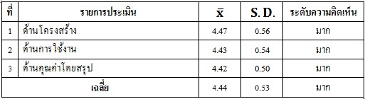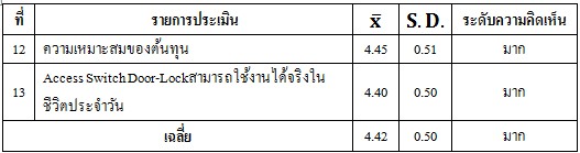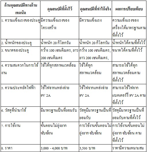 | การวิเคราะห์ข้อมูลการสร้างและหาประสิทธิภาพAccess Switch Door-Lock มีการวิเคราะห์โดยแยกเป็นตอนตามวัตถุประสงค์ของการศึกษาและผลการวิเคราะห์ข้อมูลโดยนำเสนอตามลำดับ ดังนี้ การเสนอผลการวิเคราะห์ข้อมูล ผลการวิเคราะห์ข้อมูลนำเสนอรวม 6 ตอน ดังนี้ ตอนที่ 1 ผลการวิเคราะห์ข้อมูลประสิทธิภาพของนวัตกรรม ตอนที่ 2 ผลการวิเคราะห์ข้อมูลพื้นฐานของผู้ตอบแบบสอบถาม ตอนที่ 3 ผลการวิเคราะห์ข้อมูลประเมินผลการใช้นวัตกรรมด้านโครงสร้าง ตอนที่ 4 ผลการวิเคราะห์ข้อมูลประเมินผลการใช้นวัตกรรมด้านการใช้งาน ตอนที่ 5 ผลการวิเคราะห์ข้อมูลประเมินผลการใช้นวัตกรรมด้านคุณค่าโดยสรุป ตอนที่ 6 ผลการวิเคราะห์ข้อมูลประเมินผลการใช้นวัตกรรมในภาพรวมทุกด้าน ตอนที่ 1 ผลการวิเคราะห์ข้อมูลประสิทธิภาพของนวัตกรรม ดังแสดงในตารางที่ 4.1 ตารางที่ 5 ผลการวิเคราะห์ข้อมูลประสิทธิภาพของนวัตกรรม ![]() ตอนที่ 2 ผลการวิเคราะห์ข้อมูลพื้นฐานของผู้ตอบแบบสอบถาม ตารางที่ 6 ผลการวิเคราะห์ข้อมูลพื้นฐานของผู้ตอบแบบสอบถาม ![]() จากตารางที่ 6 พบว่า ผู้ตอบแบบสอบถามทั้ง 20 คน เป็นเพศชาย 20 คน คิดเป็น 100% และอายุส่วนใหญ่อยู่ที่ เกณฑ์ต่ำกว่า 20 ปี คิดเป็น 100% ประสบการณ์ใช้งานชุดฝึก คิดเป็น 100% ตอนที่ 3 ผลการวิเคราะห์ข้อมูลประเมินผลการใช้นวัตกรรมด้านโครงสร้าง ตารางแสดงระดับความพึงพอใจในการใช้Access Switch Door-Lockที่ผ่านการใช้Access Switch Door-Lock ด้านที่ 1 ด้านโครงสร้าง คือความแข็งของเครื่อง ดังแสดงในตารางที่ 4.3 ตารางที่ 7 ผลการวิเคราะห์ข้อมูลประเมินผลการใช้นวัตกรรมด้านโครงสร้าง ![]() จากตารางที่ 8 พบว่า ความพึงพอใจในการใช้Access Switch Door-Lock ด้านโครงสร้าง โดยภาพรวมอยู่ ในระดับพึงพอใจมาก ( = 4.47) และเมื่อพิจารณาเป็นรายการประเมินพบว่า ด้านวัสดุอุปกรณ์ที่ใช้มีความเหมาะสม มีค่าเฉลี่ยมากที่สุด ( = 4.85) และด้านชุดอินพุตของอุปกรณ์ที่ใช้ในการรับข้อมูลมีความเหมาะสม มีค่าเฉลี่ยที่น้อยที่สุดคือ ( = 4.30)ตอนที่ 4 ผลการวิเคราะห์ข้อมูลประเมินผลการใช้นวัตกรรมด้านการใช้งาน ตารางแสดงระดับความพึงพอใจในการใช้Access Switch Door-Lockผู้ที่ผ่านการใช้Access Switch Door-Lock ในด้านการใช้งาน ดังแสดงในตารางที่ 4.4 ตารางที่ 8 ผลการวิเคราะห์ข้อมูลประเมินผลการใช้นวัตกรรม ด้านการใช้งาน ![]() จากตารางที่ 8 พบว่า ความพึงพอใจในการใช้Access Switch Door-Lock ด้านการใช้งาน โดยภาพรวมอยู่ในระดับพึงพอใจมาก ( = 4.43) และเมื่อพิจารณาเป็นรายการประเมินพบว่า ด้านอุปกรณ์อินพุตใช้งานได้สะดวก มีค่าเฉลี่ยมากที่สุด ( = 4.50) และด้านความง่ายต่อการซ่อมแซมบำรุงรักษา มีค่าเฉลี่ยที่น้อยที่สุด ( = 4.35)ตอนที่ 5 ผลการวิเคราะห์ข้อมูลประเมินผลการใ