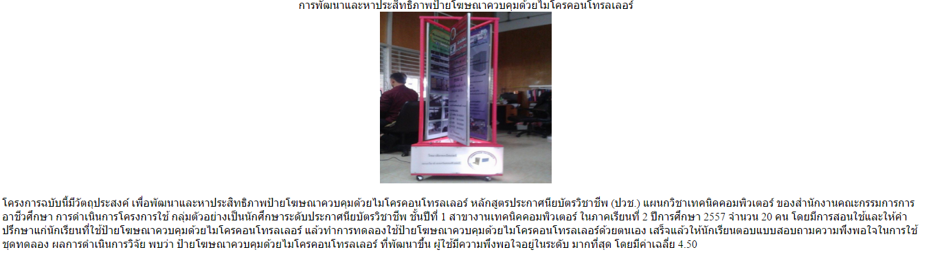 | สร้างโปรแกรมบันทึกข้อมูลผลงานนักเรียนนักศึกษาแผนกเทคนิคคอมพิวเตอร์สามารถเก็บและโชว์ผลงานนักเรียนเพื่อการเรียนรู้และพัฒนาต่อได้ | |